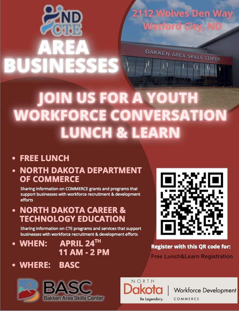 Join the Area Businesses Workforce Lunch n' Learn on April 24 from 11 a.m. - 2 p.m. for a Free Lunch and a conversation from the ND Dept. of Commerce and ND CTE to hear on specific grants and programs that will can help workforce recruitment and development efforts in Watford City.