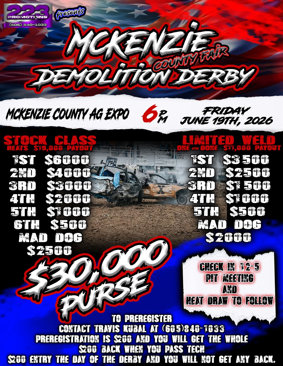 Get ready for high-impact action at the McKenzie County Fair Demolition Derby! Join us Friday, June 19th, 2026 at 6 PM at the McKenzie County Ag Expo for an adrenaline-filled night of metal-crunching excitement. Featuring Stock Class and Limited Weld (Dodge & Ox) Class with over $30,000 in purse payouts. Check-in runs from 12–5 PM, with pit meeting and heat draw to follow. Don’t miss one of the biggest derby nights of the fair!
