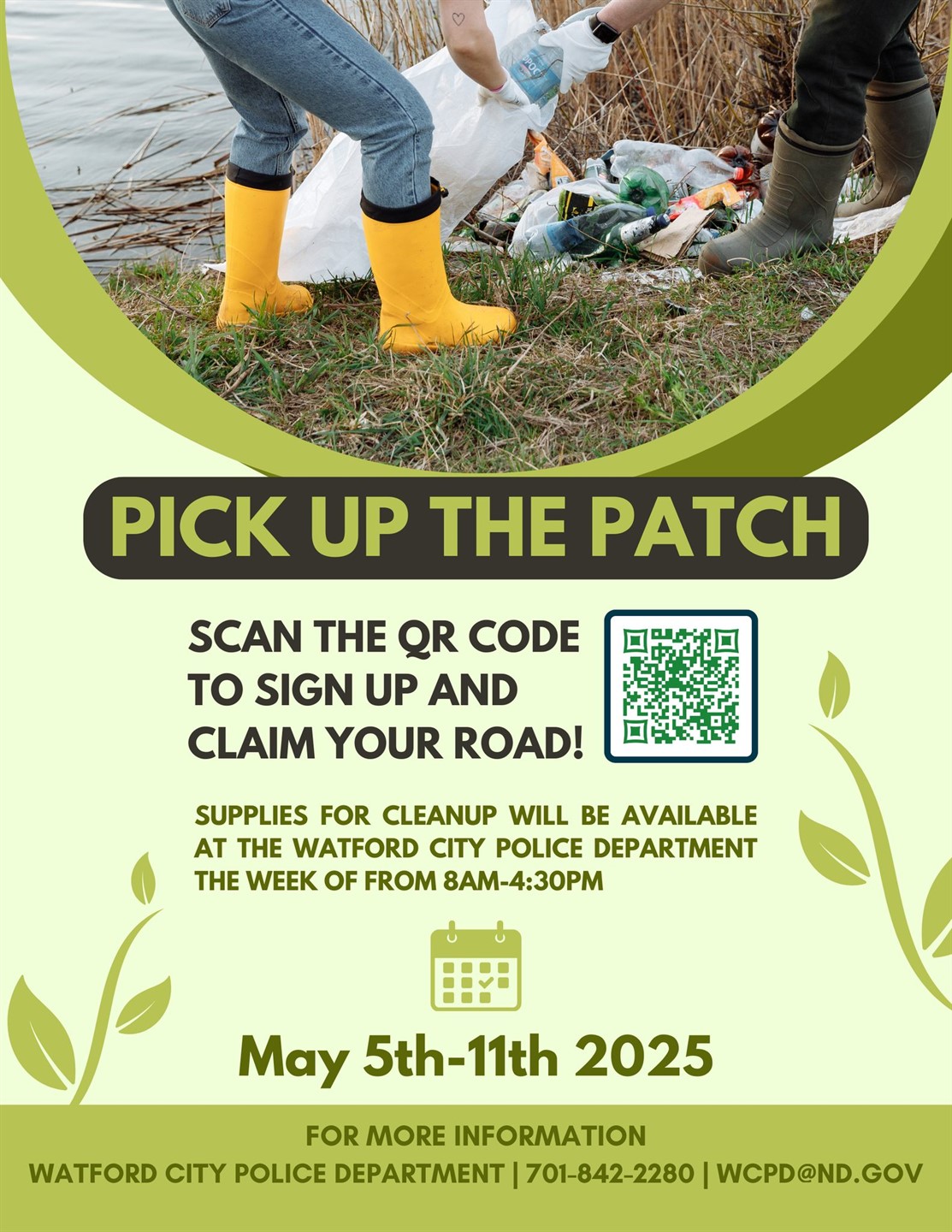 Supplies for volunteers will be available at Watford City Police Department, Monday-Friday from 8 a.m. - 4:30 p.m. the week before and week of May 5-11.
